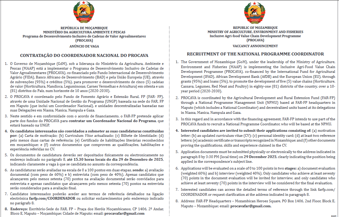 Concursos Sabetudo Novembro 27, 2025 0 Comentários Contratação do Coordenador Nacional do Procava The post Contratação do Coordenador Nacional do Procava appeared first on Diário Económico. Fonte