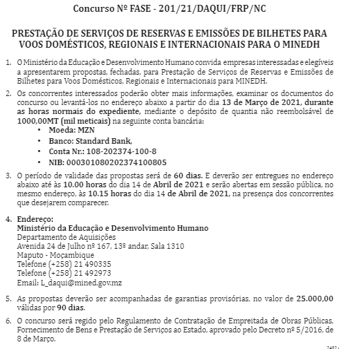 Prestação de serviços de reservas e emissões de bilhetes para voos domésticos, Regionais e Internacionais para o MINEDH.