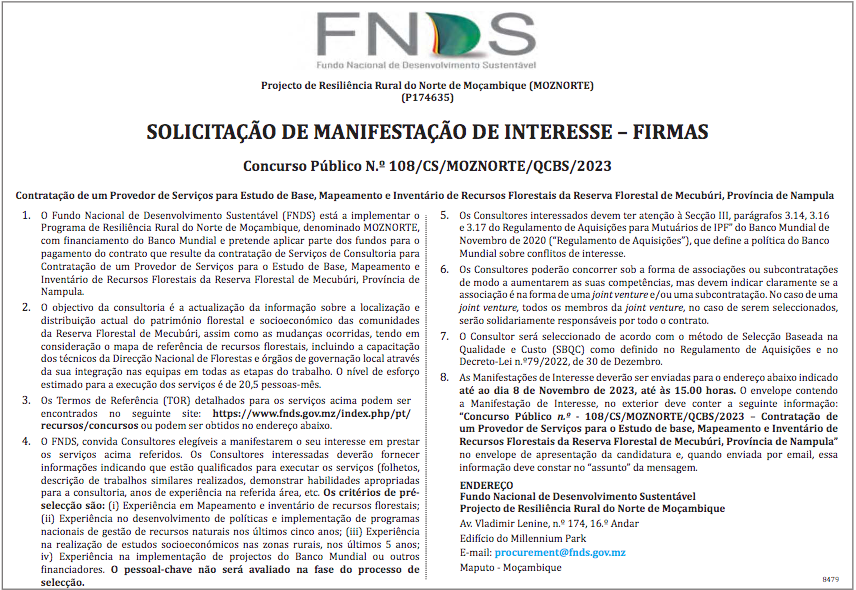 Manifestação de Interesse Para Contratação de um Provedor de Serviços Pra Estudos de Base, Mapeamento e Inventário de Recursos Florestais da Reservas Florestal de Mecubúrio, Província de Nampula