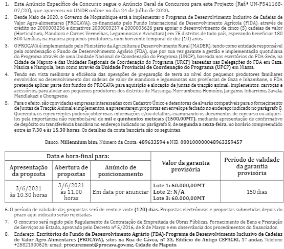 Entidade: FDA | Email: procurementmz@procavca.gov.mz