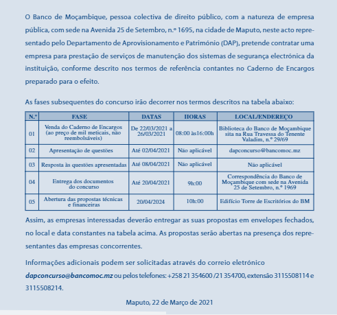 Contratação de uma empresa para manutenção dos sistemas de segurança eletrónica do Banco de Moçambique.
