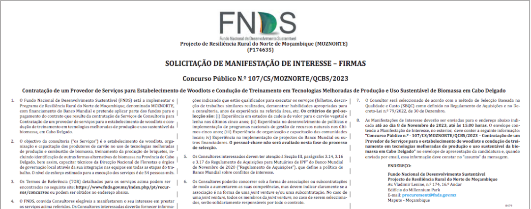 Manifestação de Interesse Preparação e Resposta a Desastres Concurso Público Maputo Diversos Concurso Expirado | Termina em: 2023-11-10 11:56:00 Concurso Para Fornecimento de Prestação de Serviços e Previsões Aos Navios Indianos Que Visitarão MaputoDurante o Mês de Novembro de 2023 Concurso Público Maputo Diversos Concurso Expirado | Termina em: 2023-11-10 11:33:00 Manifestação de Interesse Para Preparação e Resposta a Desastres Concurso Público Maputo Aquisicao de servicos Concurso Expirado | Termina em: 2023-11-10 10:45:00 Apresentação de Propostas Para Bóias de Demarcação Marítima Para Futuras Áreas de Pesca de Gestão Comunitária Concurso Público Nampula Diversos Concurso Expirado | Termina em: 2023-11-10 01:17:00 Concurso Para Contratação de Empreitada Para Construção de Terminal de Passageiros no Aeroporto de Inhambane Concurso Público Maputo Diversos Concurso Expirado | Termina em: 2023-11-09 12:09:00 Manifestação de Interesse Para Contratação de Dois Assistentes Administrativos, Baseado em Maputo Concurso Público Maputo Aquisicao de servicos Concurso Expirado | Termina em: 2023-11-09 10:58:00 Contratação de Consultoria Para a Elaboração do Plano de Sustentabilidade do Painel Dos Sistemas Alimentares em Moçambique Concurso Público Maputo Diversos Concurso Expirado | Termina em: 2023-11-08 13:51:00 Concurso Para Contratação de Serviços de Implementação de um Sistema de Service Desk Concurso Público Maputo Diversos Concurso Expirado | Termina em: 2023-11-08 11:53:00 Manifestação de Interesse Para Contratação de umProvedor de Serviços Para Estabelecimento de Woodlots e Condução de Treinamento em Tecnologias Melhoradas de Produção e Uso Sustentável de Biomassa em Cabo Delgado Concurso Público Cabo Delgado Diversos Concurso Expirado | Termina em: 2023-11-08 11:31:00 Manifestação de Interesse Para Contratação de um Provedor de Serviços Pra Estudos de Base, Mapeamento e Inventário de Recursos Florestais da Reservas Florestal de Mecubúrio, Província de Nampula Concurso Público Nampula Aquisicao de servicos Concurso Expirado | Termina em: 2023-11-08 11:18:00 ‹ 1 2 ... 15 16 17 18 19 20 21 ... 120 121 › Publicidade