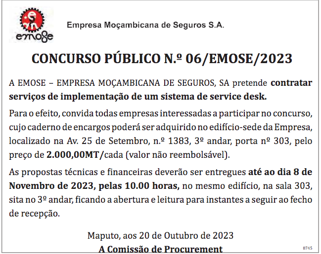 Sabetudo Categorias Material de Escritório Peças de Autocarros Comércio e Serviços Fornecimento de Serviços Fornencimentos de Equipamentos Engenharia de Comunicação e Telecomunicações Segurança e Proteção Eletricidade Serviços Elétricos Serviços Informáticos Fornecimento de Transporte Concessão de Imóvel Fornecimento de Serviços e Equipamento. Diversos Fornecimento de Alimentos Fornecimento de Viatura Produção de Material de Trabalho Fornecimento de Alimentos e produtos de Higiene Construção Civil Fornecimento de Materiais Eletricidade Prestação de Serviço Prestação de Serviço de Manutenção. Prestação de Serviços de Limpeza e Conservação. Fornecimento de Residencia. Estabelecimento de Parcerias Eletrecidade Aquisicao de servicos Servicos de Manutencao e Reparacao de Computadores Servicos de Manutencao e Reparacao de Computadores Textil e Calçado Textil e Calçado Textil e Calçado Saude Automoveis Fornecimento de combustíveis Serviços de Consultoria Consultoria Consultoria Educacional Parceria Parceria Fornecimento de Serviços de Transporte Rodoviário de gás de Petróleo Liquefeito (GPL) Fornecimento de Serviços de Transporte Rodoviário de gás de Petróleo Liquefeito (GPL) Fornecimento de Material de Escritório Contratação de um Gestor Financeiro e Das Subvenções Aditamento Fornecimento de Equipamento Informático; Mobiliário, Material de Escritório e Consumíveis de Escritório Fornecimento de Equipamento Informático; Mobiliário, Material de Escritório e Consumíveis de Escritório Fornecimento de Equipamento Informático; Mobiliário, Material de Escritório e Consumíveis de Escritório Produção e Impressão de Material IEC Produção e Impressão de Material IEC Produção e Impressão de Material IEC Fornecimento de Hologramas e Papel de Cartas Contratação de Empreitada de Obras Públicas Para Construção de Infra-estruturas Contratação de Empreitada de Obras Públicas Para Construção de Infra-estruturas Consultoria Aquisição de Viatura Aquisição de Viaturas Informática Informática Recursos Humanos Fornecimento de Bens e Prestação de Serviços Fornecimento de Furos de Aguas Fornecimento de Agua Potável Importadora de Moçambicana de Petróleo, LDA. Publicidade