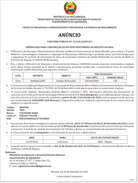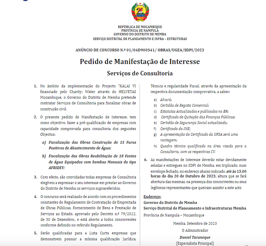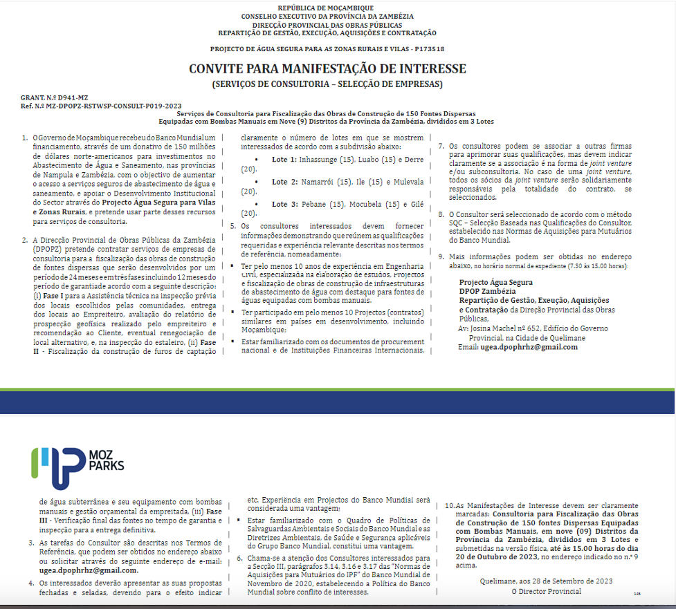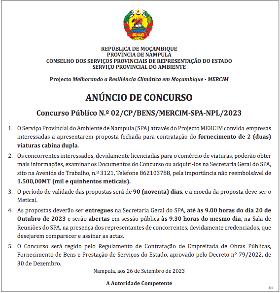 Concurso Para o Fornecimento de Equipamento Informática e Software Para Construção Concurso Público Maputo Diversos Concurso Expirado | Termina em: 2023-10-24 11:43:00 Concurso Para Contatação de Digitadores Para Lançamento de Dados do Estudo de Impacto do Programa Concurso Público Gaza Diversos Concurso Expirado | Termina em: 2023-10-24 11:41:00 Propostas Para o Fornecimento de Viaturas da Marca Toyota Concurso Público Sofala Diversos Concurso Expirado | Termina em: 2023-10-24 11:12:00 Manifestação de Interesse Para a Aquisição de Mini-Bus – DOD Concurso Público Maputo Diversos Concurso Expirado | Termina em: 2023-10-24 11:01:00 Concurso de Empreitada Para Construção de Estúdio Multimédia no Recinto do IEDA Concurso Público Maputo Diversos Concurso Expirado | Termina em: 2023-10-21 14:40:00 Manifestação de Interesse Para Serviços de Consultoria Para Fiscalização Das Obras de Construção de 15 Furos Positivos de Abastecimento de Água; Fiscalização Das Obras de Reabilitação de 18 Furos de Água Equipadas Com Bombas Manuais do Tipo Afridev Concurso Público Nampula Diversos Concurso Expirado | Termina em: 2023-10-20 23:28:00 Manifestação de Interesse Para Serviços de Consultoria Para Fiscalização Das Obras de Construção de 159 Fontes Dispersas Equipadas Com Bombas Manuais em Nove Distritos da Província da Zambézia Concurso Público Zambezia Diversos Concurso Expirado | Termina em: 2023-10-20 23:12:00 Concurso Para Aquisição de Mobiliário Hospitalar e de Escritório; Reprodução Gráfica de Instrumentos de Registo e Guiões Diversos; Aquisição de Material e Equipamento Médico-Hospitalar; Aquisição de Material Equipamento de IT; Aquisição de Motorizadas Concurso Público Maputo Diversos Concurso Expirado | Termina em: 2023-10-20 19:10:00 Concurso Para Aquisição de Mobiliário Hospitalar e de Escritório; Reprodução Gráfica de Instrumentos de Registo e Guiões Diversos; Aquisição de Material e Equipamento Médico-Hospitalar; Aquisição de Material Equipamento de IT; Aquisição de Motorizadas Concurso Público Maputo Aquisicao de servicos Concurso Expirado | Termina em: 2023-10-20 18:13:00 Concurso Para o Fornecimento de Duas Viaturas Cabina Dupla Concurso Público Nampula Diversos Concurso Expirado | Termina em: 2023-10-20 15:25:00 ‹ 1 2 ... 21 22 23 24 25 26 27 ... 120 121 › Publicidade