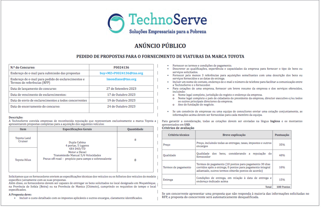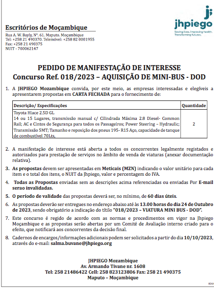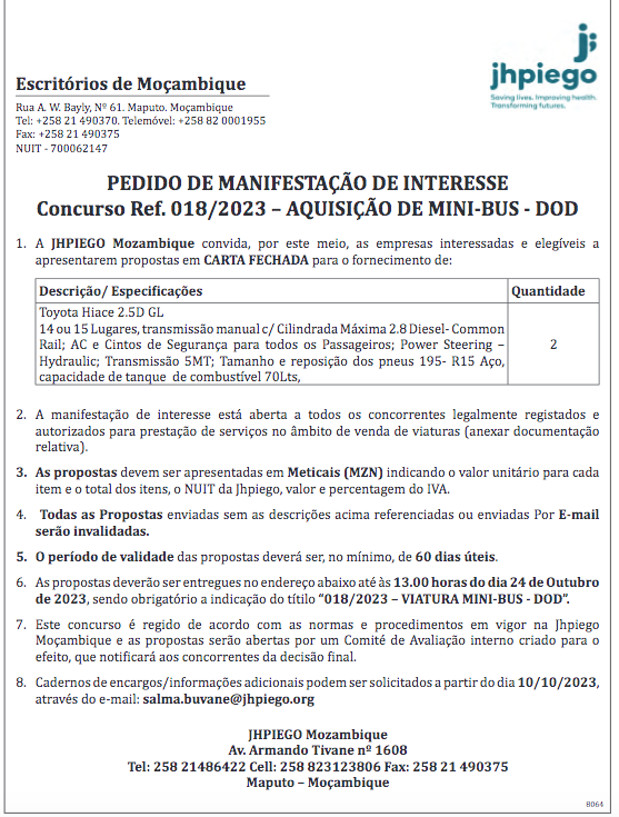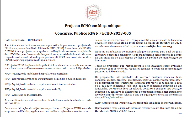 Sabetudo Categorias Material de Escritório Peças de Autocarros Comércio e Serviços Fornecimento de Serviços Fornencimentos de Equipamentos Engenharia de Comunicação e Telecomunicações Segurança e Proteção Eletricidade Serviços Elétricos Serviços Informáticos Fornecimento de Transporte Concessão de Imóvel Fornecimento de Serviços e Equipamento. Diversos Fornecimento de Alimentos Fornecimento de Viatura Produção de Material de Trabalho Fornecimento de Alimentos e produtos de Higiene Construção Civil Fornecimento de Materiais Eletricidade Prestação de Serviço Prestação de Serviço de Manutenção. Prestação de Serviços de Limpeza e Conservação. Fornecimento de Residencia. Estabelecimento de Parcerias Eletrecidade Aquisicao de servicos Servicos de Manutencao e Reparacao de Computadores Servicos de Manutencao e Reparacao de Computadores Textil e Calçado Textil e Calçado Textil e Calçado Saude Automoveis Fornecimento de combustíveis Serviços de Consultoria Consultoria Consultoria Educacional Parceria Parceria Fornecimento de Serviços de Transporte Rodoviário de gás de Petróleo Liquefeito (GPL) Fornecimento de Serviços de Transporte Rodoviário de gás de Petróleo Liquefeito (GPL) Fornecimento de Material de Escritório Contratação de um Gestor Financeiro e Das Subvenções Aditamento Fornecimento de Equipamento Informático; Mobiliário, Material de Escritório e Consumíveis de Escritório Fornecimento de Equipamento Informático; Mobiliário, Material de Escritório e Consumíveis de Escritório Fornecimento de Equipamento Informático; Mobiliário, Material de Escritório e Consumíveis de Escritório Produção e Impressão de Material IEC Produção e Impressão de Material IEC Produção e Impressão de Material IEC Fornecimento de Hologramas e Papel de Cartas Contratação de Empreitada de Obras Públicas Para Construção de Infra-estruturas Contratação de Empreitada de Obras Públicas Para Construção de Infra-estruturas Consultoria Aquisição de Viatura Aquisição de Viaturas Informática Informática Recursos Humanos Fornecimento de Bens e Prestação de Serviços Fornecimento de Furos de Aguas Fornecimento de Agua Potável Importadora de Moçambicana de Petróleo, LDA. Publicidade