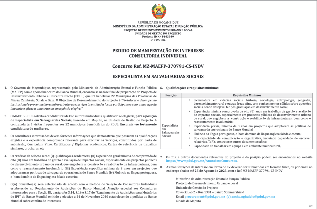 Manifestação de Interesse de Consultoria Para Realização de um Estudo de Optimização da Gestão do Parque Habitacional da HCB na Vila do Songo, Província de Tete Concurso Público Tete Fornecimento de Serviços Concurso Expirado | Termina em: 2023-08-28 10:28:00 Concurso Para Contratação de Três Técnicos Superiores de Saúde N1, na Categoria de Farmacêutico A Concurso Público Maputo Fornecimento de Serviços Concurso Expirado | Termina em: 2023-08-28 10:10:00 Manifestação de Interesse Para Elaboração de Alternativas de Subsistência Para as Comunidades do Mangal Concurso Público Maputo Fornecimento de Serviços Concurso Expirado | Termina em: 2023-08-28 10:09:00 Manifestação de Interesse Para Contratação de Serviços de Consultoria e Fiscalização Das Obras de Reabilitação de 117 km da Estrada N301 Matambo – Maroeira Concurso Público Tete Fornecimento de Serviços Concurso Expirado | Termina em: 2023-08-28 09:57:00 Concurso de Empreitada de Obra Para Reabilitação e Modernização da Clínica II do HCM; Prestação de Serviço de Fumigação e Desratização Para a Clínica Especial do HCB; Fornecimento de 12 Lâmpadas Cilíticas Para Clínica Especial do HCM Concurso Público Maputo Fornecimento de Serviços Concurso Expirado | Termina em: 2023-08-28 00:22:00 Manifestação de Interesse Para Contratação de Especialista em Salvaguardas Sociais Concurso por Cotações Maputo Fornecimento de Serviços Concurso Expirado | Termina em: 2023-08-25 12:03:00 Contratação de Serviços de Consultoria Para Capacitação de Agentes Comunitários de Fiscalização Florestal da Província de Tete Concurso Público Maputo Fornecimento de Serviços Concurso Expirado | Termina em: 2023-08-25 10:32:00 Concurso Para Fornecimento e Montagem do Sistema de Câmeras de Vídeo Vigilância (CCTV) Concurso Público Maputo Fornecimento de Serviços Concurso Expirado | Termina em: 2023-08-25 10:18:00 Contratação de Serviços de Um(a) Especialista Sénior em Tecnologia de Informação e Comunicação (TIC) Concurso Público Maputo Fornecimento de Serviços Concurso Expirado | Termina em: 2023-08-24 11:30:00 Contratação de Empreitada Para Construção de Três Mercados Retalhistas Concurso Público Maputo Fornecimento de Serviços Concurso Expirado | Termina em: 2023-08-23 12:19:00 ‹ 1 2 ... 33 34 35 36 37 38 39 ... 120 121 › Publicidade