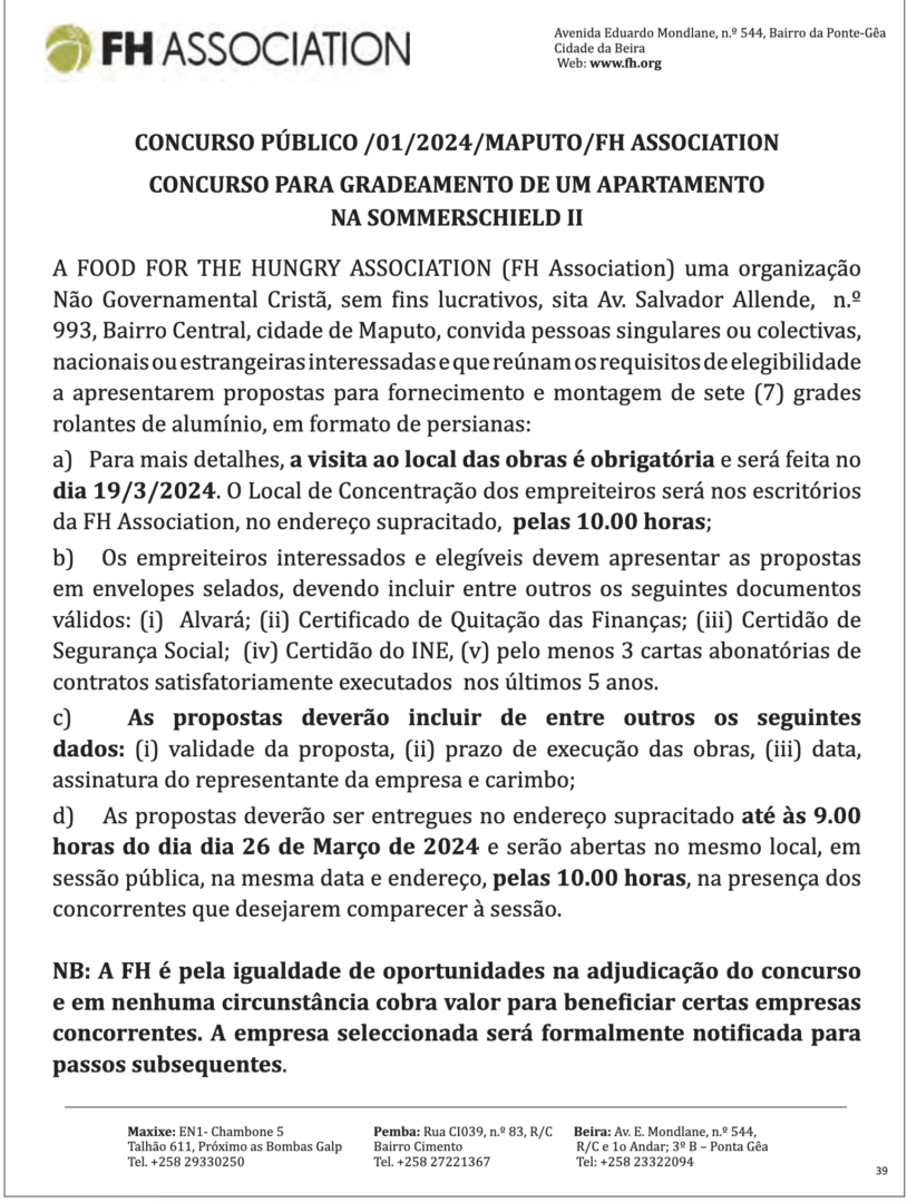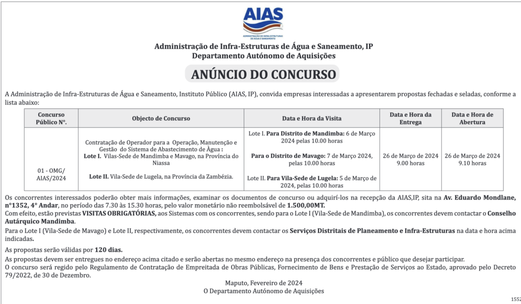 Concurso Para Fornecimento de Materiais Diversos Para Projecto SPARC Concurso Público Maputo Aquisicao de servicos Concurso Expirado | Termina em: 2024-04-12 14:07:00 Concurso Para Requalificar, Construir, Uso e Devolução de Uma Unidade de Comercio ou Similar no Âmbito PPP no Terreno Das Antigas Oficinas de CMC Concurso Público Maputo Diversos Concurso Expirado | Termina em: 2024-04-12 13:53:00 Concurso Para Provimento da Vaga do Director Geral do Instituto Superior Politécnico de Songo Concurso Público Sofala Aquisicao de servicos Concurso Expirado | Termina em: 2024-04-11 13:50:00 Concurso Para Contratação de Uma Empresa de Consultoria Com Experiencia no Sector da Aquacultura Para a Revisão Externa Final do Projecto “Escalonamento da Aquacultura Lucrativa em Moçambique” Concurso Público Maputo Aquisicao de servicos Concurso Expirado | Termina em: 2024-04-04 18:03:00 Solicitação de Propostas Para Fornecimento de Materiais Essenciais, Como Parte da Preparação Para Respostas a Emergências no Programa de Abastecimento de Água, Saneamento e Higiene Concurso Público Maputo Aquisicao de servicos Concurso Expirado | Termina em: 2024-04-01 14:00:00 Apresentação de Propostas Seladas Para Realização de Actividades de Teatro, Palestras de Saúde Concurso Público Maputo Aquisicao de servicos Concurso Expirado | Termina em: 2024-03-28 13:55:00 Concurso Para Contratação de Empeirada de Obras Para Reabilitação de Estradas Rurais na Província do Niassa Concurso Público Niassa Aquisicao de servicos Concurso Expirado | Termina em: 2024-03-27 18:05:00 Concurso Para Contratação de Operador Para a Operação, Manutenção e Gestão do Sistema de Abastecimento de Agua: Vilas-Sede de Mandimba e Mavago, na Província do Niassa e Vila-Sede de Lugela, na Província da Zambézia Concurso Público Maputo Aquisicao de servicos Concurso Expirado | Termina em: 2024-03-27 15:34:00 Concurso Para Construção de Três Salas de Aulas no Bairro Vumba (Zona de Madjecadjeca); Contratação Para Fornecimento de um Camião Porta Contentores; Contratação Para Fornecimento de Contentores de Resíduos Sólidos; Contratação Para Fornecimento de 150 Candeeiros Para Iluminação Publica Concurso Público Manica Aquisicao de servicos Concurso Expirado | Termina em: 2024-03-27 15:22:00 Concurso Para Gradeamento de um Apartamento na Sommershield Concurso Público Maputo Diversos Concurso Expirado | Termina em: 2024-03-26 18:08:00 ‹ 1 2 3 4 5 6 7 8 9 10 ... 120 121 › Publicidade